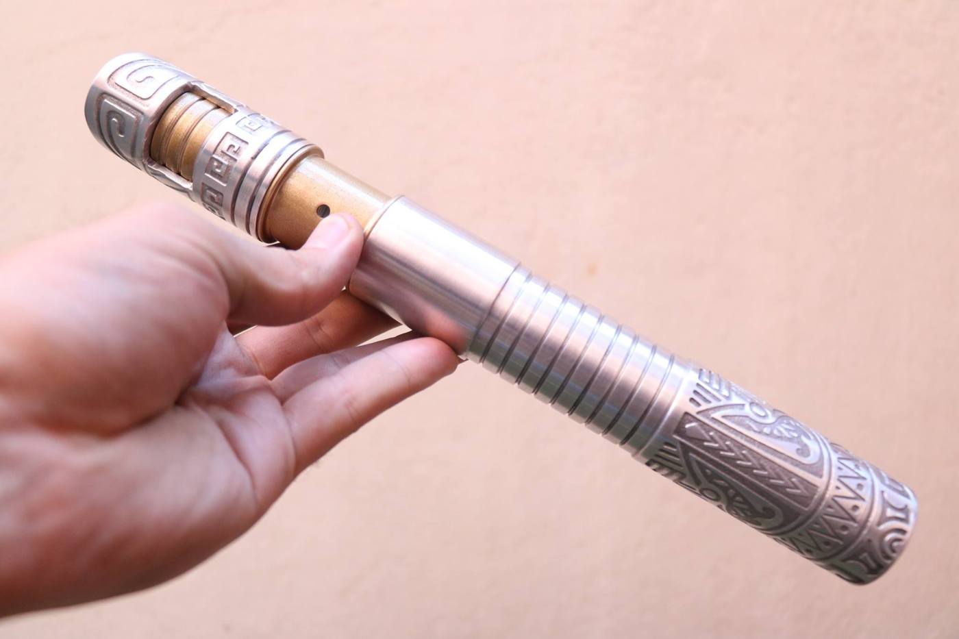 Nouvelle imprimante 3D prévue pour jeudi, en attendant, le prototype du sabre « Maohi » est terminé. Finalement, le powder coating cuivre antique gâchait la gravure et a donc été retiré pour le moment.